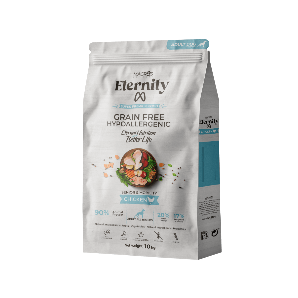Sudėtis: vištiena (šviežia vištiena 20%, dehidratuota vištiena 17%), bulvės, ankštiniai augalai, alaus mielės, mėsos hidrolizatas (jautienos 4%), augalinės skaidulos (lignoceliuliozė, obuolių skaidulos), žuvų aliejus, daržovės (cikorija, morkos, žaliosios pupelės, ropė), mineralinės medžiagos, jukos ekstraktas, kompleksas sąnariams (gliukozamino hidrochloridas, chondroitino sulfatas, žaliųjų midijų ekstraktas), manano-oligosacharidai, frukto-oligosacharidai, taurinas, augaliniai priedai (medetkos, šalavijas, ožragė, krapai, čiobreliai, erškėtuogės), prebiotikai, augaliniai ekstraktai (raudonieji vaisiai, citrusai, margainio sėklos, žaliosios arbatos sėklos, mėta, rozmarinas), natūralūs antioksidantai, L-karnitinas, probiotikai.