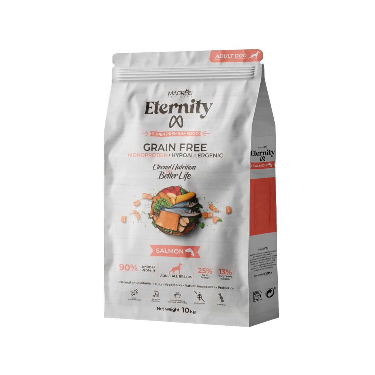 Hipoalerginis, vieno baltymo, begrūdis sausas maistas su lašiša suaugusiems vidutinių ir didelių veislių šunims.